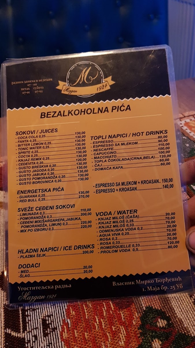 At Kafe Majdan 1924 (1. Maja 25, Ub), the menu feels refreshingly straightforward, focusing on the essentials that suit both quick stop-ins and longer, relaxed sits. For drinks, there’s a clear emphasis on familiar local picks: Beer and Pivo cover the classic options you’d expect in a Serbian café setting, easy to pair with casual conversation or a slow evening. Coffee lovers aren’t left out either-Produženi Espreso Sa Mlekom stands out as a dependable choice when you want something stronger than a regular coffee but still softened with milk. If you’re keeping it simple, Voda is there as a no-fuss option that fits any time of day. For something sweeter and more playful, the Plazma Šejk is the highlight among the non-alcoholic choices, tapping into a familiar regional flavor that feels both comforting and distinctly local. Overall, the selection prioritizes recognizable favorites over unnecessary complexity, which makes ordering fast, predictable, and satisfying-especially if you value a café that delivers the classics without overcomplicating them.